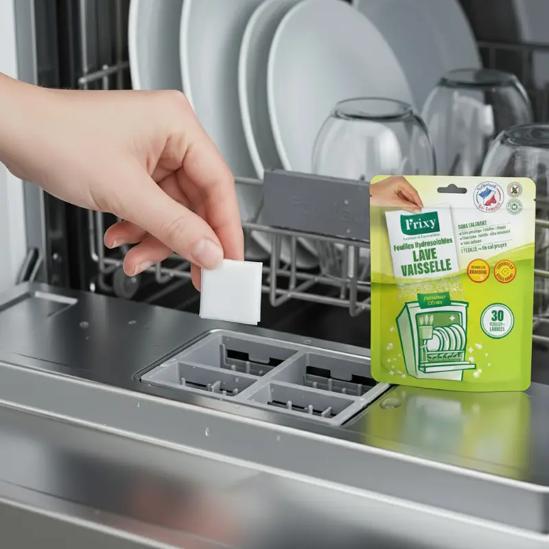 Oubliez tout ce que vous saviez sur le lavage en machine. Les feuilles lave-vaisselle hydrosolubles FRIXY sont conçues pour remplacer les pods et tablettes traditionnels. Notre innovation est une formule responsable qui offre une propreté éclatante, sans résidu suspect sur votre vaisselle et sans plastique (PVA) inutile.