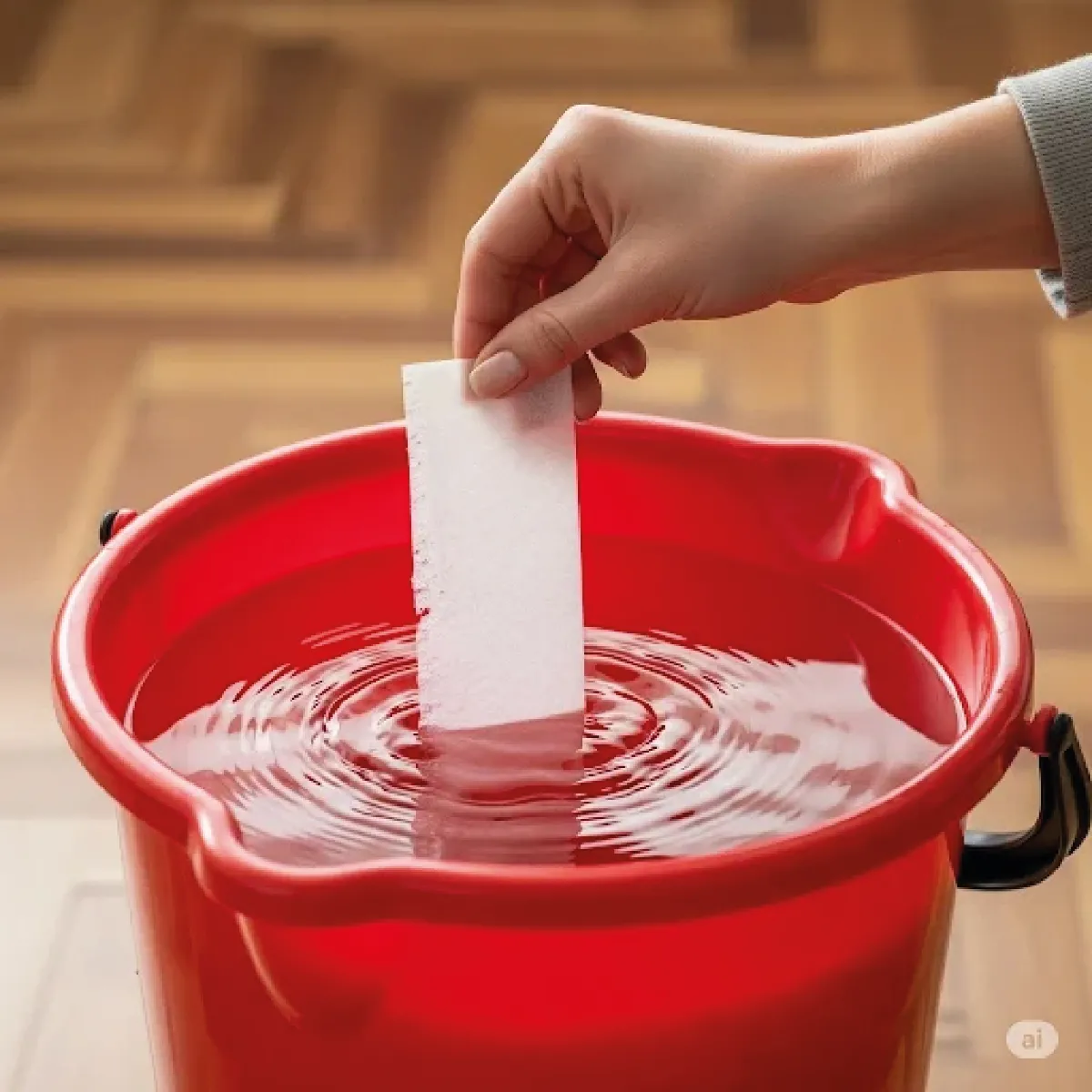 Ou de dissoudre 1 à 2 feuilles (en fonction de l’état de saleté) dans un seau d’eau chaude (environ 5 litres). Attendez quelques secondes pour une dissolution complète.